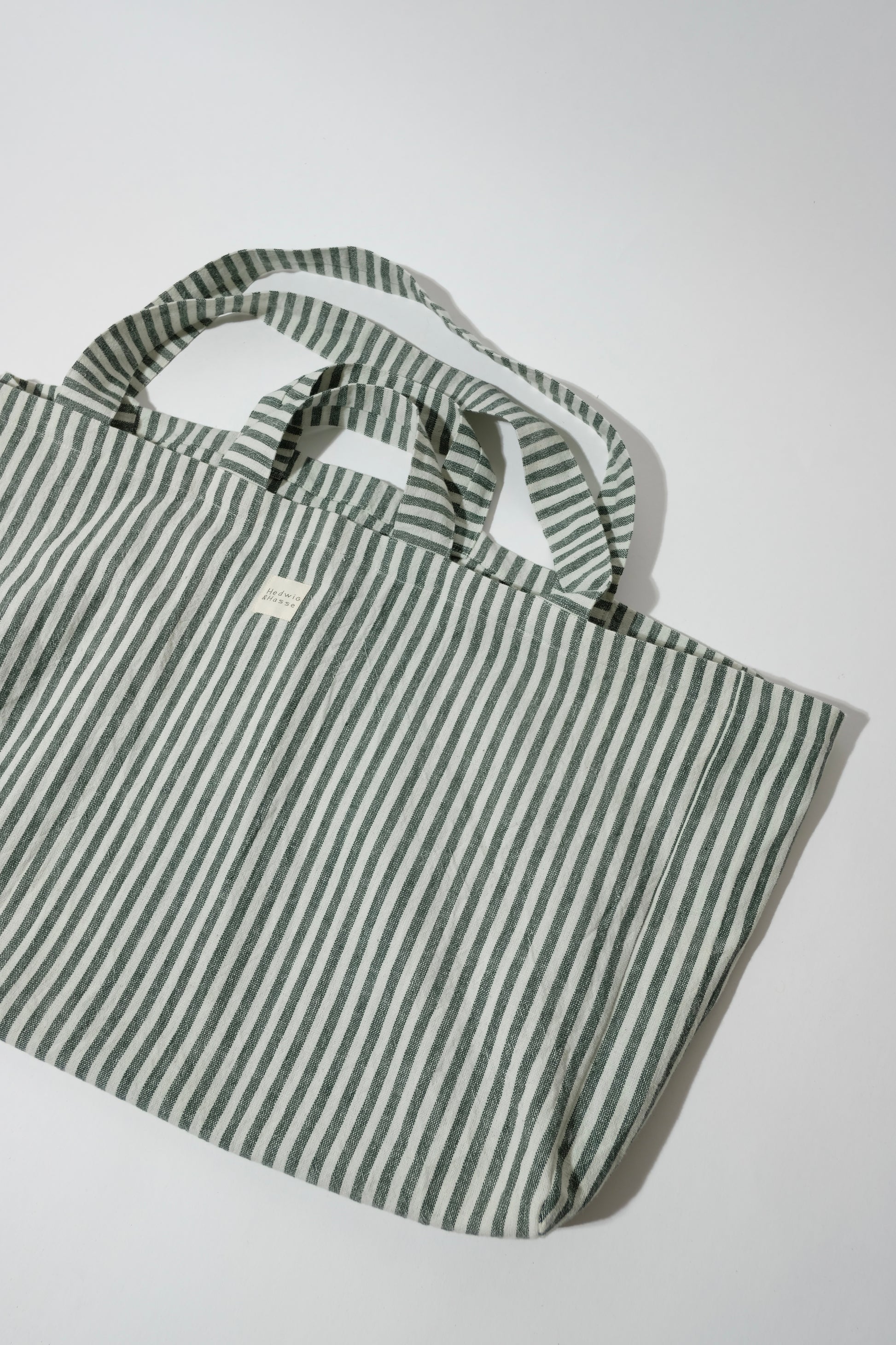 A large bag made from cotton in a bold coastal navy and creme stripe. The Big Cotton Carry Bag has two handels, a smaller one, and a large handle that fits over the shoulder.